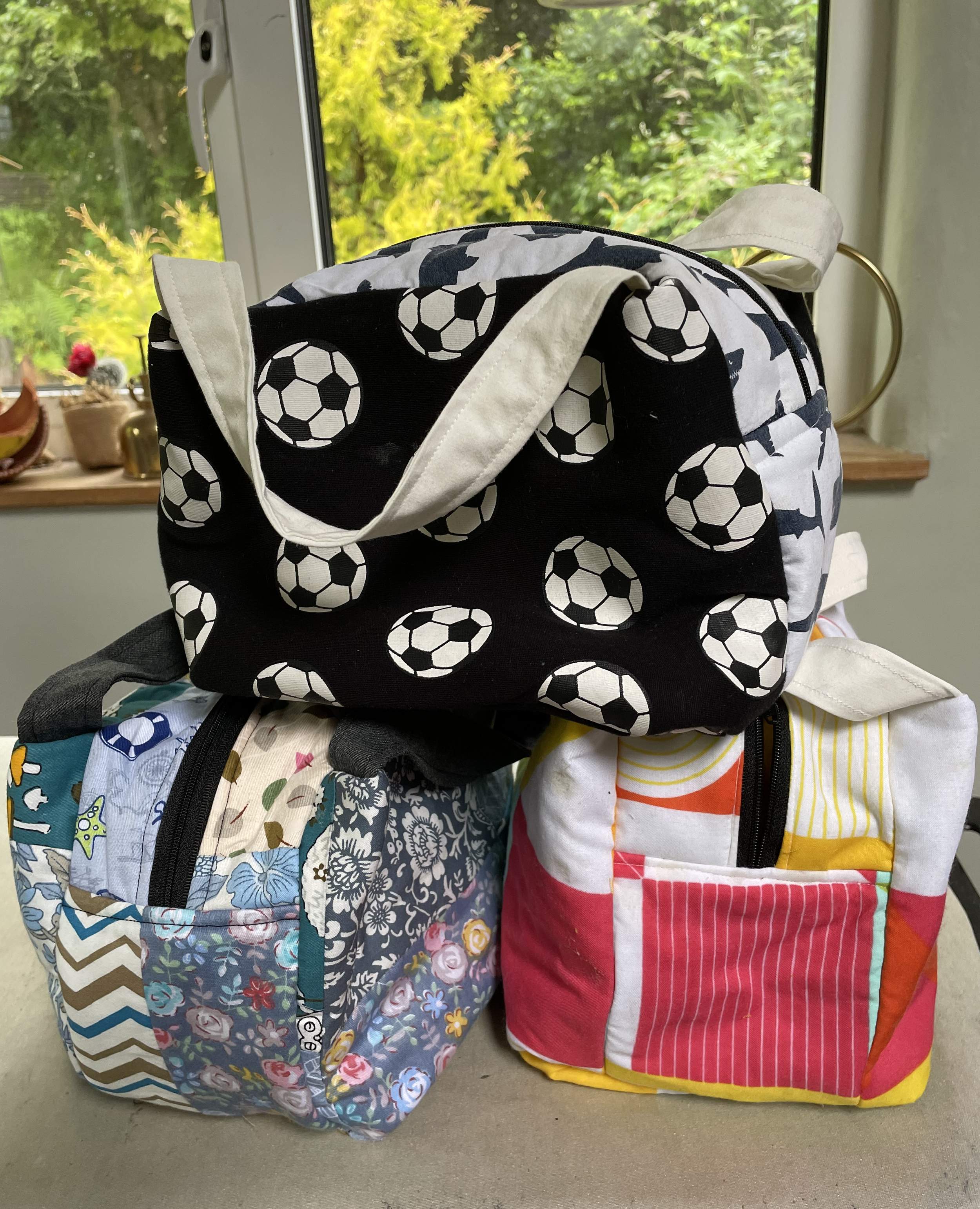 A sturdy, lined, chubby bag, with handles and a metal zip closing. Approx. 22 by 14 by 14cm. Ideal as a lunch bag, or a large bag for make up (or treasure).